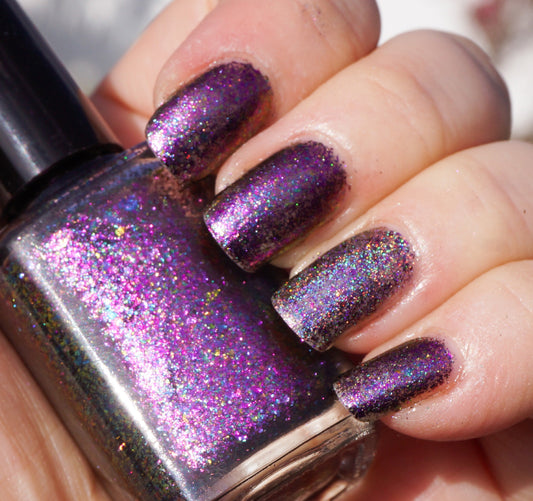Some nail polishes in this collection are also linear holographic. Holographic - forming a full rainbow all at once (a rainbow 'arc' is formed). This is in contrast to multichrome/colorshifting - one color becomes another if you turn your nails in another direction.