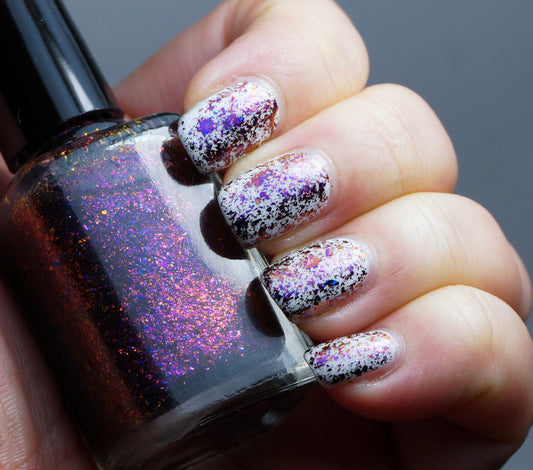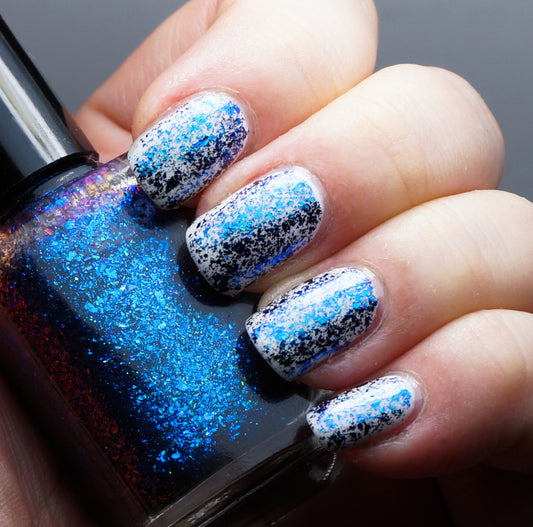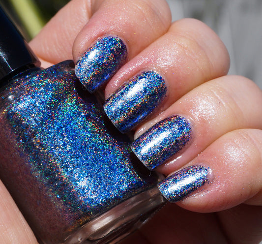 Some nail polishes in this collection are also linear holographic. Holographic - forming a full rainbow all at once (a rainbow 'arc' is formed). This is in contrast to multichrome/colorshifting - one color becomes another if you turn your nails in another direction.