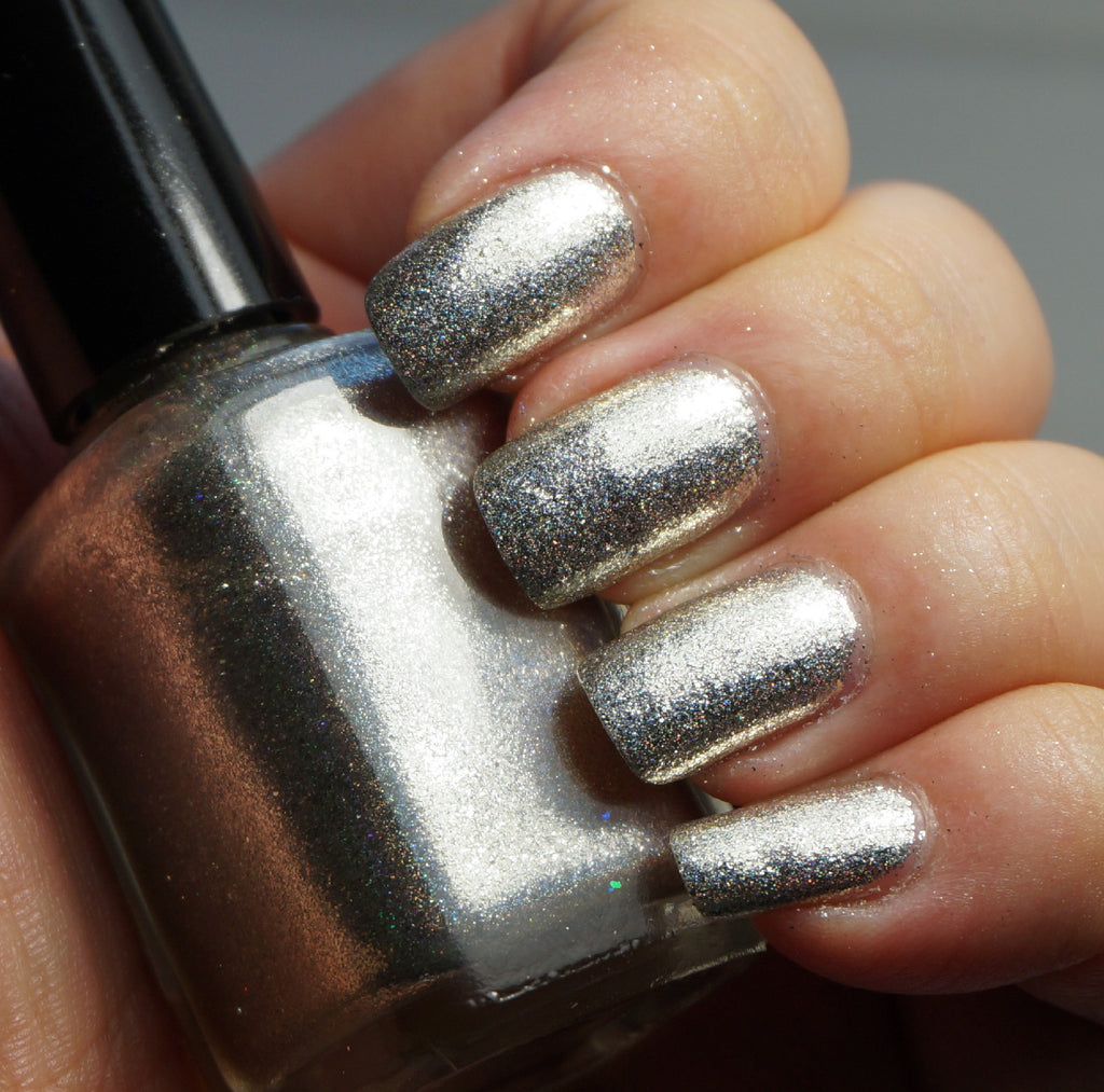 Bridal Veil is a strong linear holographic polish with a mix of multiple sizes of real silver flakies, smaller sizes than the flakies in Putting on the Ritz, Moonlight and A Star to Sail By.  High coverage, and a brighter silver color than Putting on the Ritz (a slight golden cast), Moonlight (a greyer and more true silver color) or A Star to Sail By (golden & pink hued).